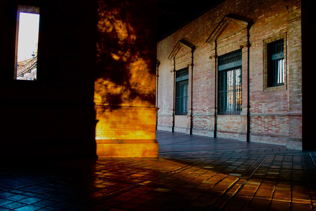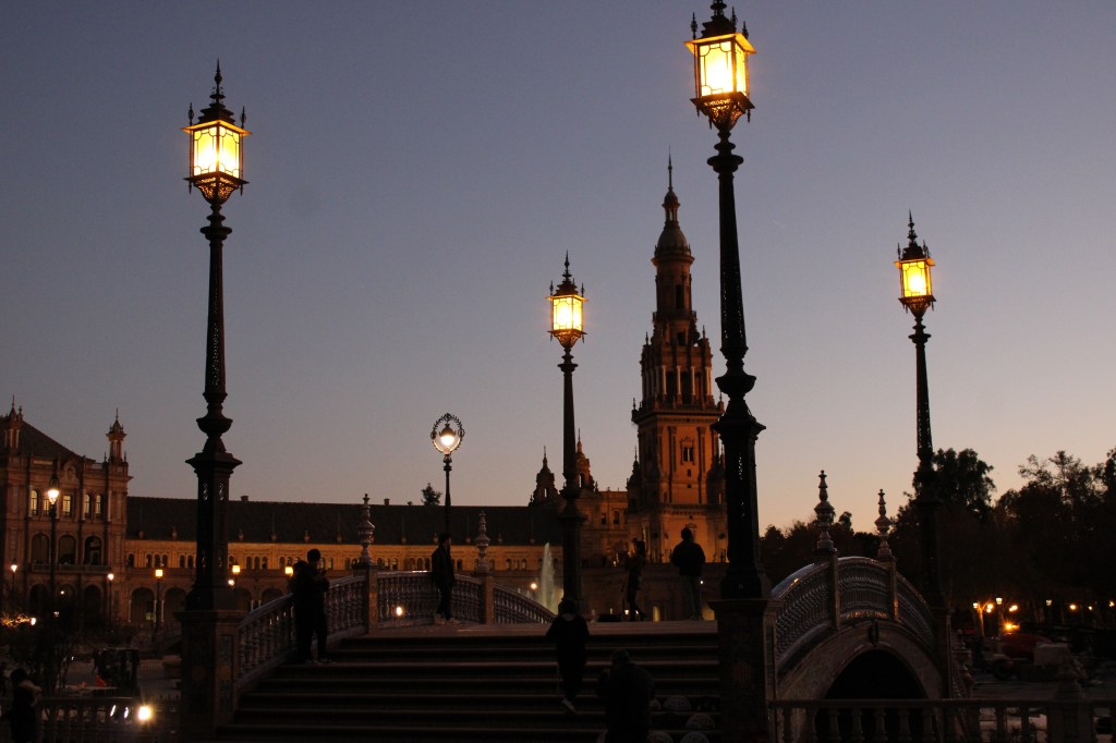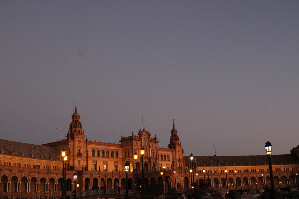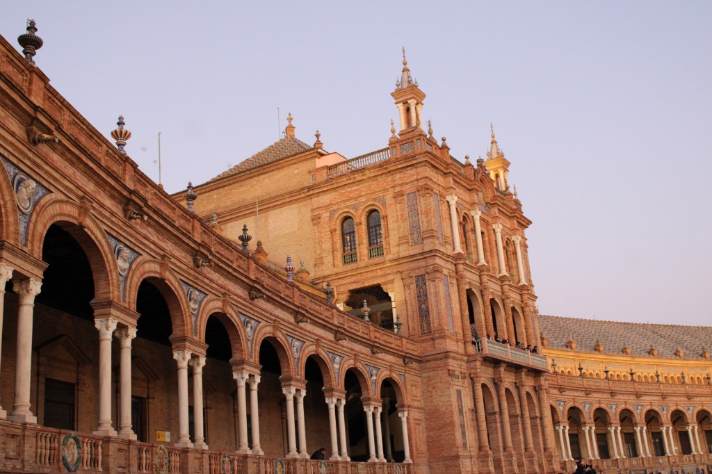The Plaza de España is an impressive semi-circle whose beauty multiplied due to the time of the day we arrived there. The evening sun played on the walls and the floors of this red stone building, and we stayed on until the onset of the night, seeing it lit up by the yellow lights.