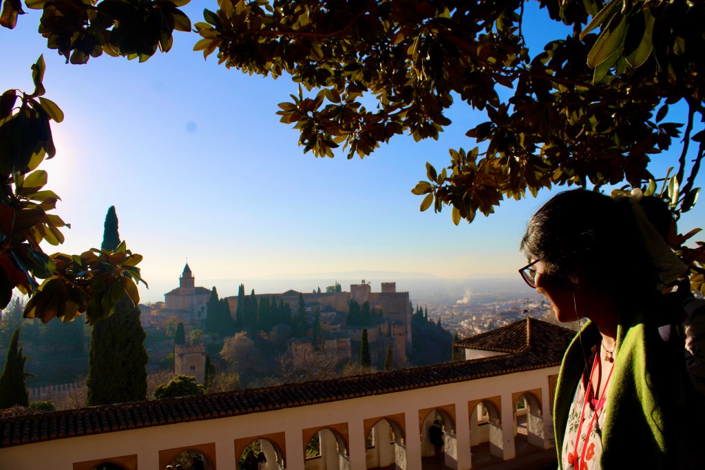 Our day trip to Alhambra started at 7 in the morning. The three hour journey from Seville to Granada was itself very enjoyable. It was quite something to watch the white villages enroute wake up to the orange sun. I listened to music, the song that especially hit the spot was ‘Yun hi chala chat’ from Swades. Other times I listened to Spanish guitar tracks on Spotify, rolled up my Strickjacke into a ball and slept.